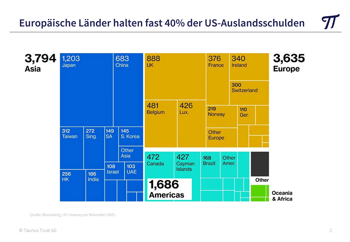 Es mag vor diesem Hintergrund viele Investoren überraschen, dass wir das eigentliche Problem ganz woanders verorten. Die weltweiten Schuldenexzesse insbesondere der öffentlichen Haushalte bereiten uns Bauchweh. In den USA ist die Staatsverschuldung inzwischen auf über 39.000 Milliarden $ gestiegen – eine unvorstellbare Summe. Die Zinsausgaben der US-Regierungen haben sich allein in den letzten 10 Jahren von gut 400 Mrd. $ jährlich auf deutlich über 1.200 Mrd. $ mehr als verdreifacht! Um überhaupt noch genügend Bondkäufer zu finden, wird der Schuldenberg immer kurzfristiger finanziert. Gut ein Drittel aller ausstehenden Staatsschulden wird in den nächsten 12 Monaten zur Rückzahlung fällig. Wie dies refinanziert werden soll, ist uns ein Rätsel. Ausländische Anleger halten immer noch über 9.000 Mrd. $ an US Treasuries. Sie wollen ihre Bestände eher abbauen, seit die Amerikaner den Dollar als Waffe einsetzen und das Vertrauen erodiert. Die Schuldenexzesse sind aber nicht auf die USA beschränkt, sondern ein globales Phänomen.