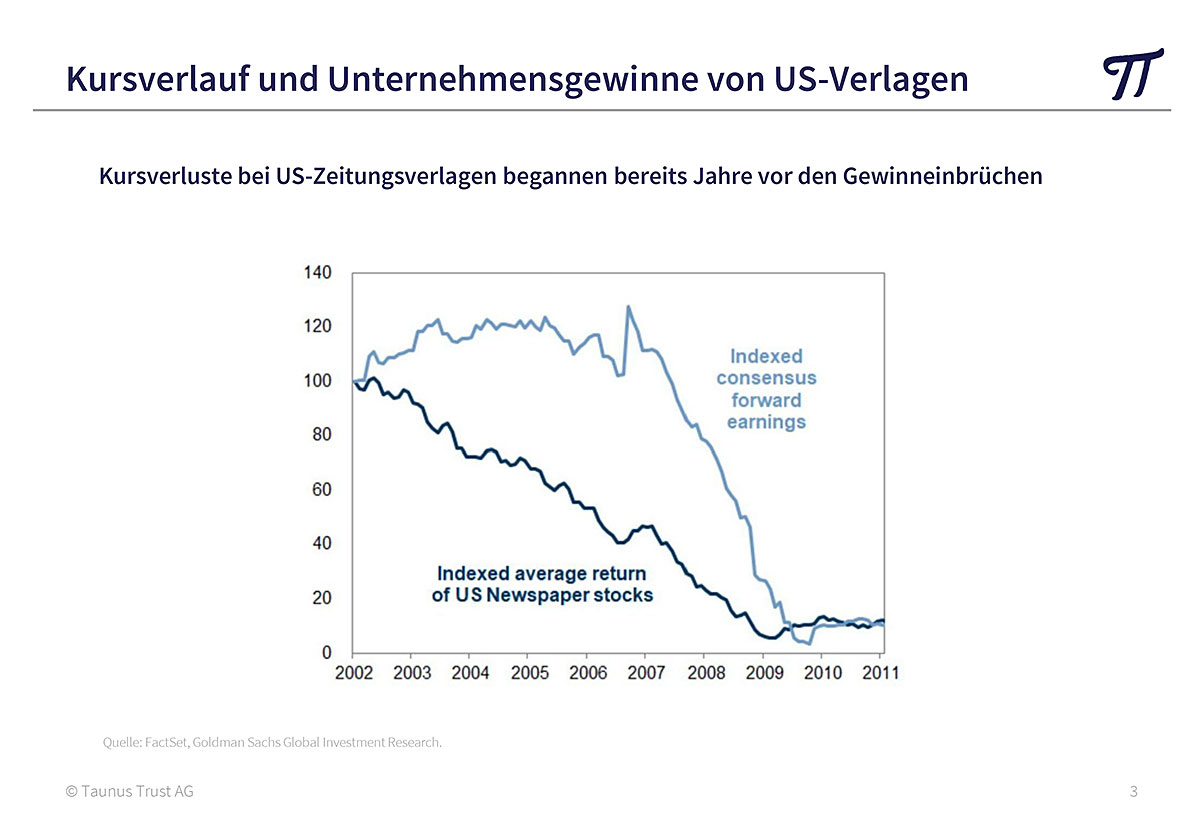 Man fragt sich, warum es wieder einmal viele private und institutionelle Investoren auf dem falschen Fuß erwischt hat. Es ist kein Zufall, dass über die letzten 10 Jahre 96% aller US-Aktienfonds risikobereinigt schlechter als ihre Benchmark abgeschnitten haben. Unseres Erachtens liegt es daran, dass die Antizipationsfunktion der Börsen unterschätzt wird. Wie am Beispiel der Aktien amerikanischer Zeitungsverlage gezeigt werden kann, beginnen die Kursrückgänge bereits Jahre bevor die Unternehmensgewinne ihren Höhepunkt erreicht haben.