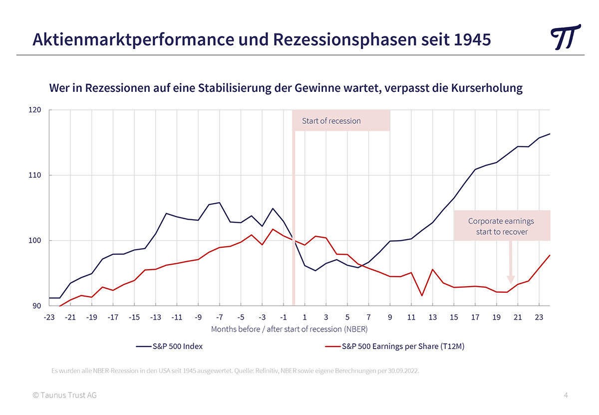 Wenn man also Aktien hält, solange die Unternehmensgewinne steigen, kommt man automatisch ins Hintertreffen. Deshalb ist es sinnvoll, antizyklisch zu agieren. Aktien kauft man am besten, wenn sich die schlechten Nachrichten häufen und keiner die Papiere haben will. Deshalb ist es sinnvoll, vor allem in Rezessionsphasen Aktien zu erwerben. Wer in Rezessionen auf eine Stabilisierung der Gewinne wartet, verpasst in der Regel die Kurserholung. Besonders gefährlich ist es, wenn nach einer längeren Hausse auf die Veröffentlichung extrem guter Unternehmensergebnisse keine weiteren Kursgewinne folgen. Umgekehrt ist es ein gutes Zeichen, wenn in einer Baisse die Aktienkurse bei schlechten Nachrichten nicht weiter nachgeben oder sogar steigen.