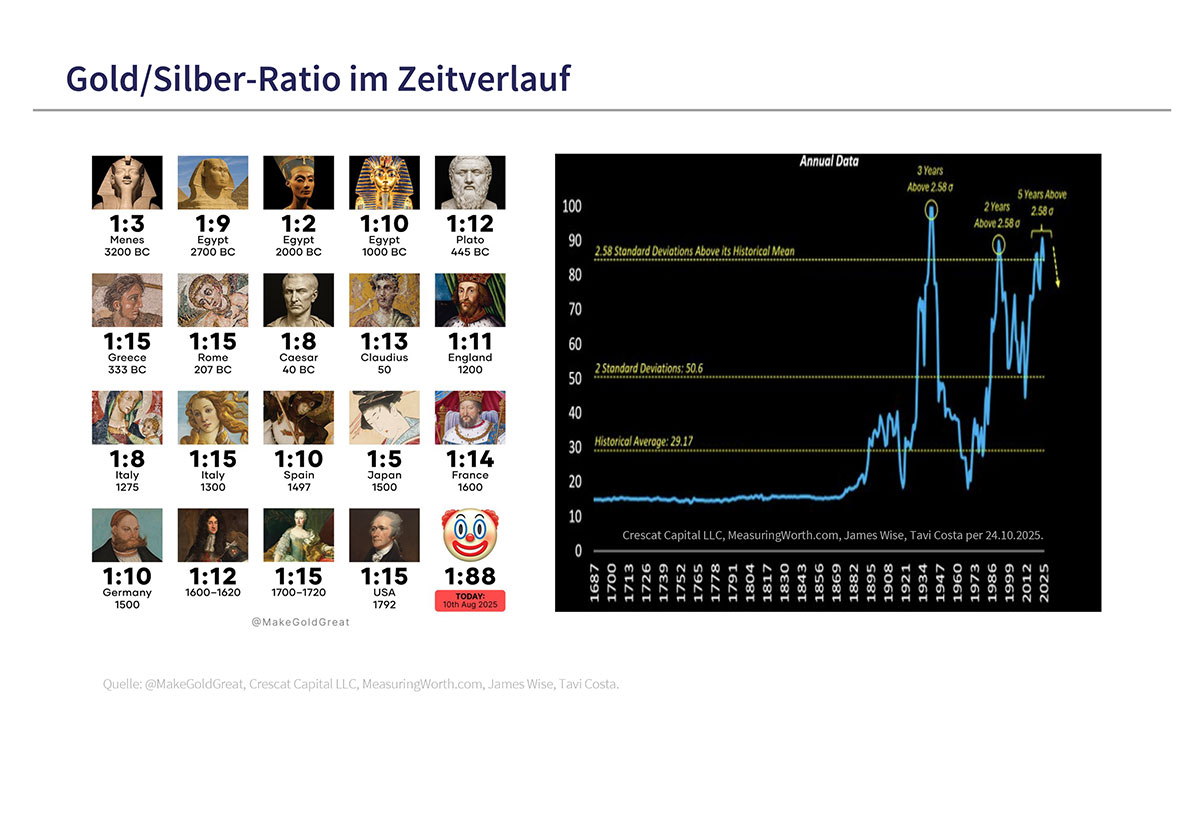 Das Material, das die Notenbanken aufkaufen, verschwindet langfristig vom Markt. Für eine Unze Gold kann man derzeit 85 Unzen Silber kaufen. In den letzten 5 Jahrtausenden war das Gold/Silber-Ratio deutlich niedriger. Das spricht dafür, das Silber über ein höheres Kurspotential verfügt, zumal es für neue Technologien benötigt und verbraucht wird. Seit Jahren wird mehr Silber verbraucht als neu gefördert.