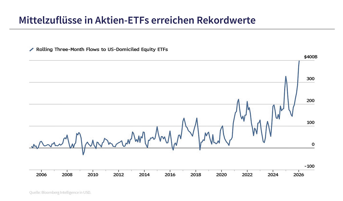 Trotz dieser Warnsignale haben die Anleger in den letzten Monaten munter weiter gekauft und die Rekordsumme von 400 Mrd. $ neu in US-Aktien-ETFs gepumpt