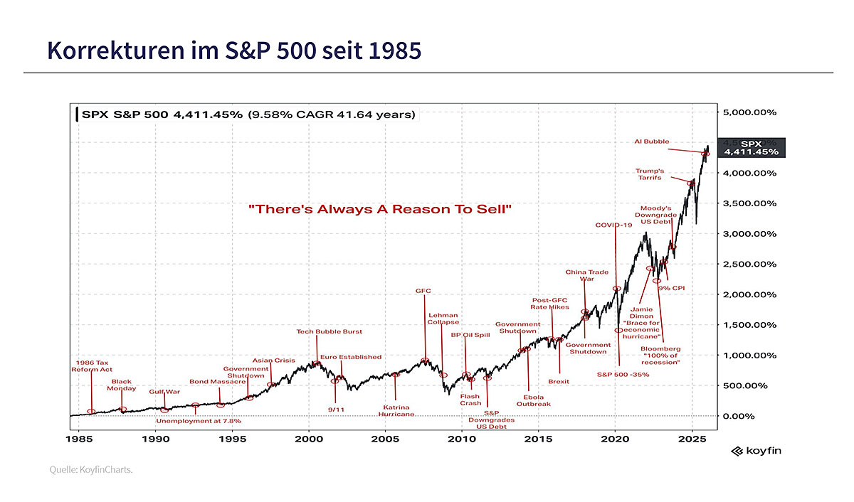 Der aktuelle Melt-up-Boom wird verursacht durch die Flucht der Anleger in Sachwerte (Aktien, Edelmetalle, Rohstoffwerte) und raus aus den Anleihen und Währungen überschuldeter Staaten. Auch der Euro ist eine Schwachwährung und profitiert lediglich von der Verlagerung aus dem Dollarbereich. Doch auch in solchen Aufwärtstrends sind scharfe Korrekturen nichts Ungewöhnliches oder gar ein Unglück. Sie sind im Gegenteil wie ein reinigendes Gewitter, das die Bewertungen wieder in normale Größenordnungen bringt (mean reversvion). Die schwachen Hände werden abgeschüttelt, wie Altmeister Kostolany zu sagen pflegte.