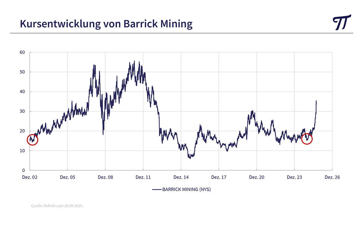 So haben wir vor zwei Jahren mehrfach auf zwei Bereiche aufmerksam gemacht, die diese Kriterien in idealer Weise erfüllten: Goldminen und chinesische Aktien. Goldminen haben den Anstieg des Goldpreises lange nicht mitgemacht. Barrick Mining, einen der weltweit führenden Goldproduzenten, konnte man vor einem Jahr mit 15 $ noch zum selben Kurs kaufen wie 2003, obwohl sich der Preis des gelben Metalls seither verzehnfacht hat. Chinesische Aktien galten bis Anfang letzten Jahres als nicht investierbar, weil man befürchtete, dass China in einem Handelskrieg mit den USA den Kürzeren ziehen wird und der Handel mit Chinaaktien verboten würde. Inzwischen zeigt sich, dass das Reich der Mitte im Ringen um Dominanz den USA durchaus Paroli bieten kann und der technologische Fortschritt in vielen Bereichen unglaublich schnell vonstattengeht. Beide beschriebenen Bereiche haben langfristig weiter ein beträchtliches Potential.