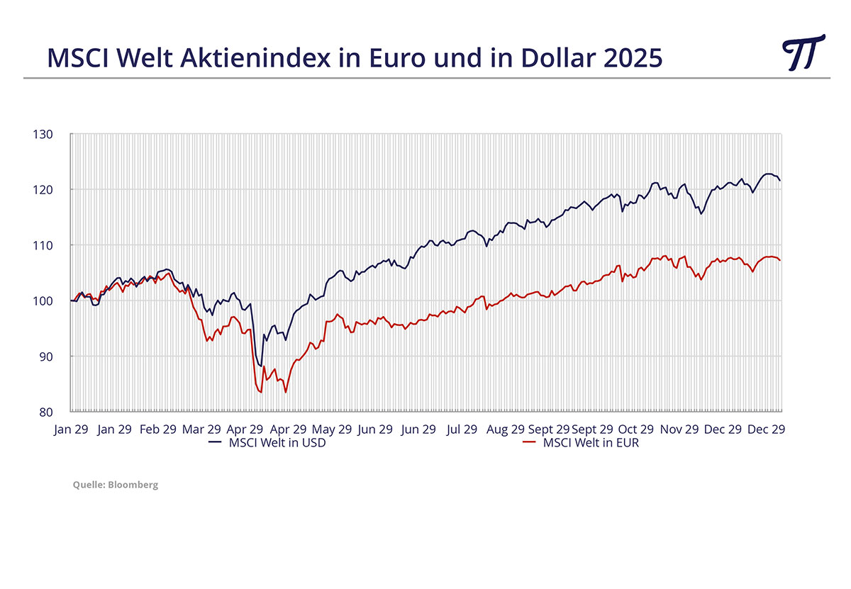 Überhaupt haben Währungsverluste 2025 die schönen Kursgewinne an den Börsen deutlich dezimiert. So stieg der MSCI Welt Aktienindex in US-Dollar um stolze 21,6%. In Euro blieben davon gerade einmal 7,3% übrig.