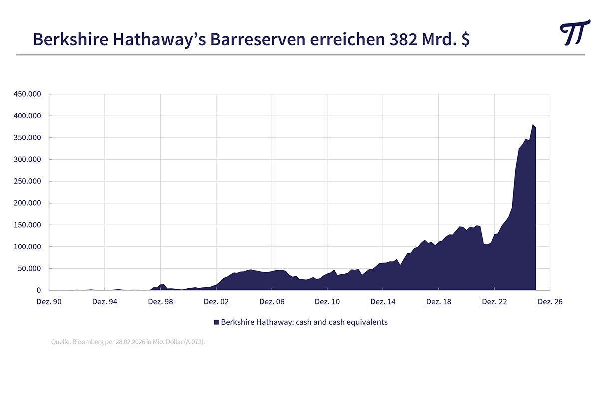 Warren Buffett, einer der erfolgreichsten Investoren, nutzt als Indikator die Börsenkapitalisierung im Verhältnis zum Bruttosozialprodukt. Auch dieser Indikator signalisiert „teure“ Aktienmärkte. Als Folge hat er die Kassenbestände bei seiner Holding Berkshire Hathaway durch Aktienverkäufe auf ein Rekordniveau ausgebaut und sitzt auf 382 Milliarden $ an liquiden Mitteln.