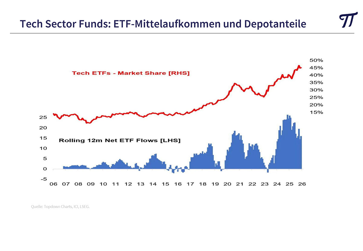 Für eine längere Rotationsbewegung spricht die völlig einseitige Investition der Anleger in amerikanischen Aktien und hier insbesondere in Technologiewerten. Der typische ETF-Investor hält ungefähr die Hälfte seines Portfolios in Tech-Aktien.