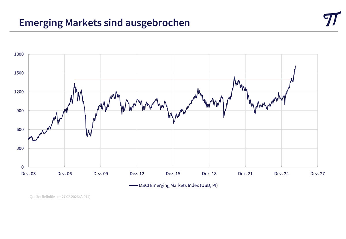 So werden in ETFs auf den S&P 500 und den NASDAQ 100 allein 3.529,8 Mrd. USD gehalten, während es im STOXX Europe gerade einmal 40,8 Mrd. USD sind. Von der Rotationsbewegung dürften neben US-Value-Aktien vor allem die internationalen Märkte, Energie- und Rohstoffe sowie die Emerging Markets profitieren, die zusätzlich Nutznießer von einer Flucht aus Dollar-Anlagen wären. Speziell die Börsen der Schwellenländer sind erst vor kurzem aus einer langjährigen Seitwärtsbewegung ausgebrochen und haben noch Luft nach oben.